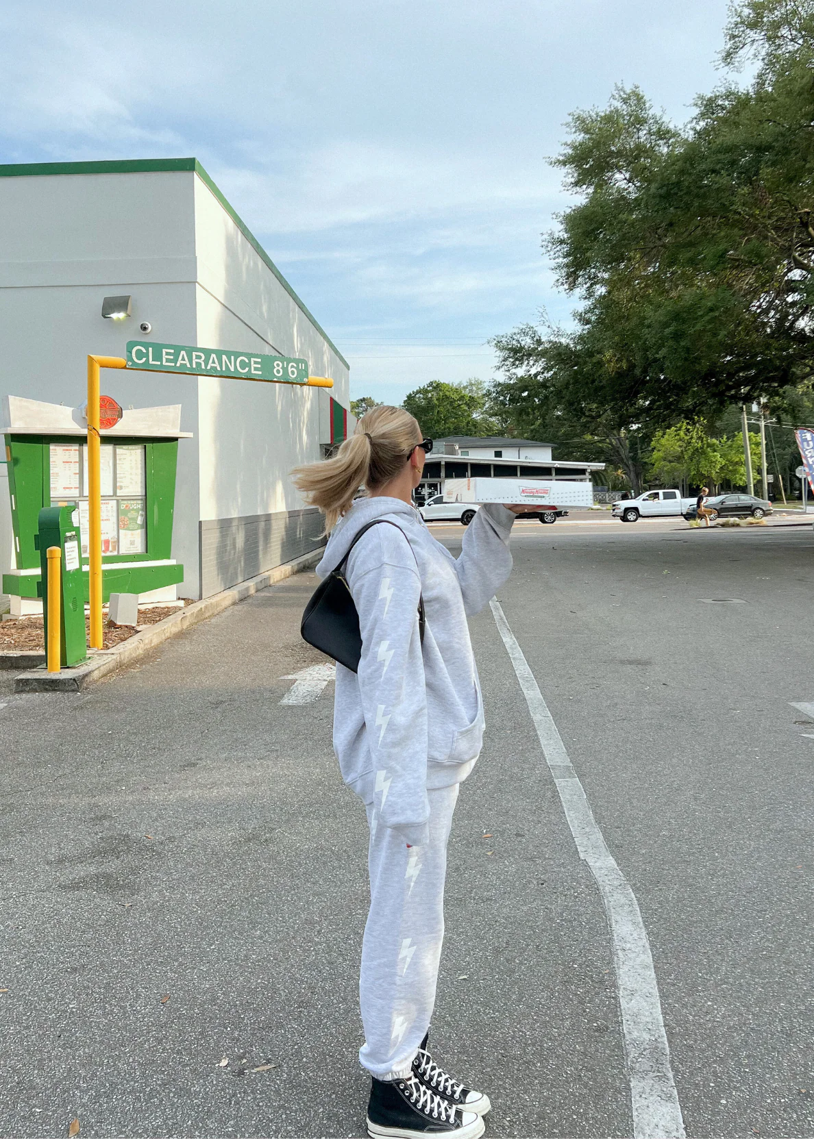 - Heather gray hoodie with white lightning bolts down the side of both arms